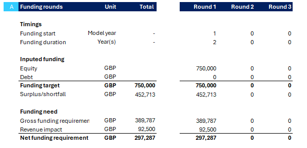 In this section, we have outputs that are at the investment round level (so dependent on the inputs on size, structure and timing of funding) and we have annual assumptions running over the forecast period. This output section gives you an idea of the funding that you require to deliver your plan and this is simply driven by assessing the shortfall in cash that the calculations show. If you are never short of cash then the model will show that you do not actually need any funding.