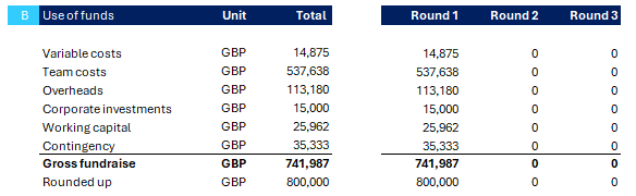 This section is very important when it comes to pitch decks and discussing investment with investors - this is the "need". It shows you what you will spend the funding on across six core cost buckets - note this is based on the gross funding need. We would suggest to always have a contingency as this just mitigates any risk from the plan.