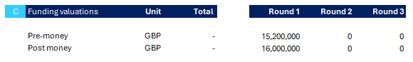This section shows you the different valuations of your company at each investment round. We've split this out and "pre" and "post" money valuations (to understand what these concepts are please refer to the financial glossary that comes with this financial model) - the key here is that each funding round should show an increase in valuation showing that you are progressing, growing and hiting your milestones.