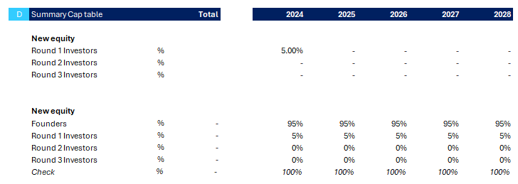This section is the cap table it shows the structure of the equity in the business and will show your dilution at each funding round and ultimately who owns what % of the company throughout the forecast period - this is important as the equity will dictate the returns that you as founders and your investors make.