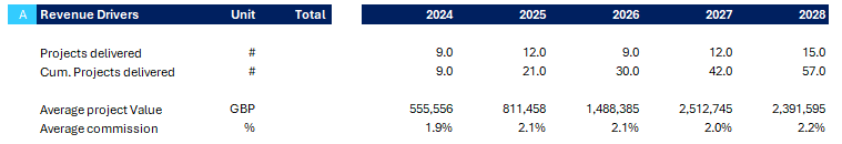 This summarises your key revenue drivers and will be bespoke to your business model - it will give you an idea of the volume of work carried out, projects delivered or products sold. It is not only to assess each individual year but also the evolution over the five years and compare year on year. Generally, to be attractive to an investor or show financially viable and healthy business, you would expect all the numbers to go up year on year but this is dependent on your business situation.