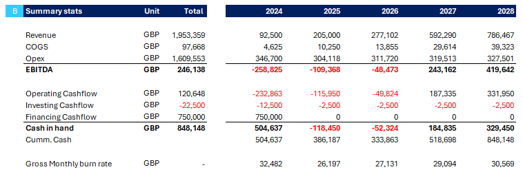 This is a beat summary table of the financials and a good sense check - as mentioned above, you would expect and hope that the key revenue numbers and profit numbers will increase year on year and that the cash position improves year on year. We also include a gross monthly burn rate, a useful stat to assess the monthly costs that need to be covered by the business - this can also increase as the business grows.