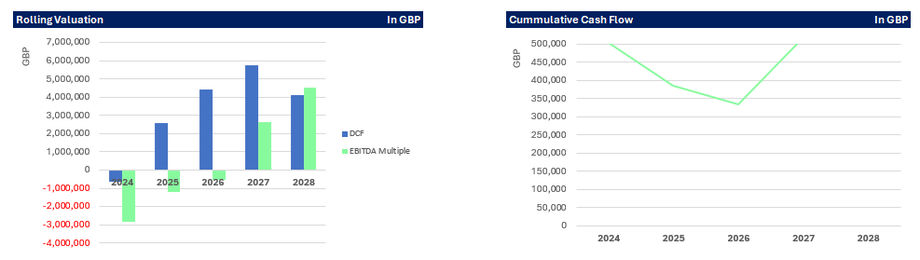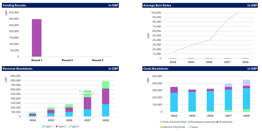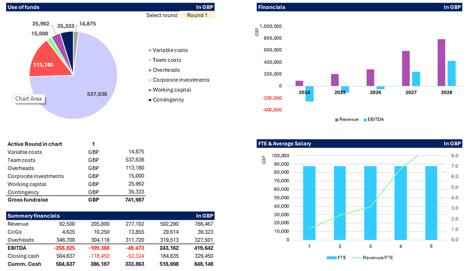 The idea of this section is that you have the charts and tables that can easily be inserted into your investor materials such as a pitch deck or investment teaser. This section is dynamic and so will update as you change the model inputs. They are also open to be configured to reflect your branding in terms of colours and fonts.